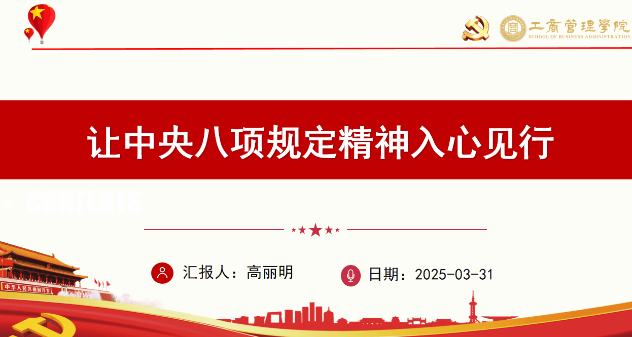 为深入贯彻中央八项规定精神,进一步加强作风建设,落实全面从严治党要求,3月31日下午,工商管理学院党委书记高丽明作了《让中央八项规定精神入心见行》的专题党课,学院全体师生党员参加。