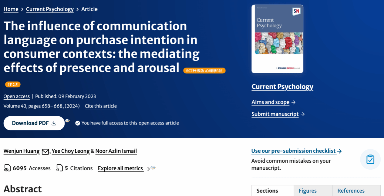 黄文珺博士的论文《The influence of communication language on purchase intention in consumer contexts: the mediating effects of presence and arousal》(《消费语境中沟通语言对购买意愿的影响:临场感与唤醒的中介效应》)发表于心理学SSCI二区权威期刊《Current Psychology》,被Web of Science核心库收录,并被《Journal of Retailing and Consumer Services》(IF 10.2)等顶级期刊引用共12次,体现了该研究在心理学与行为科学领域的认可度。