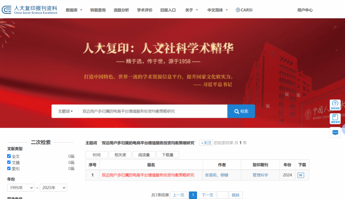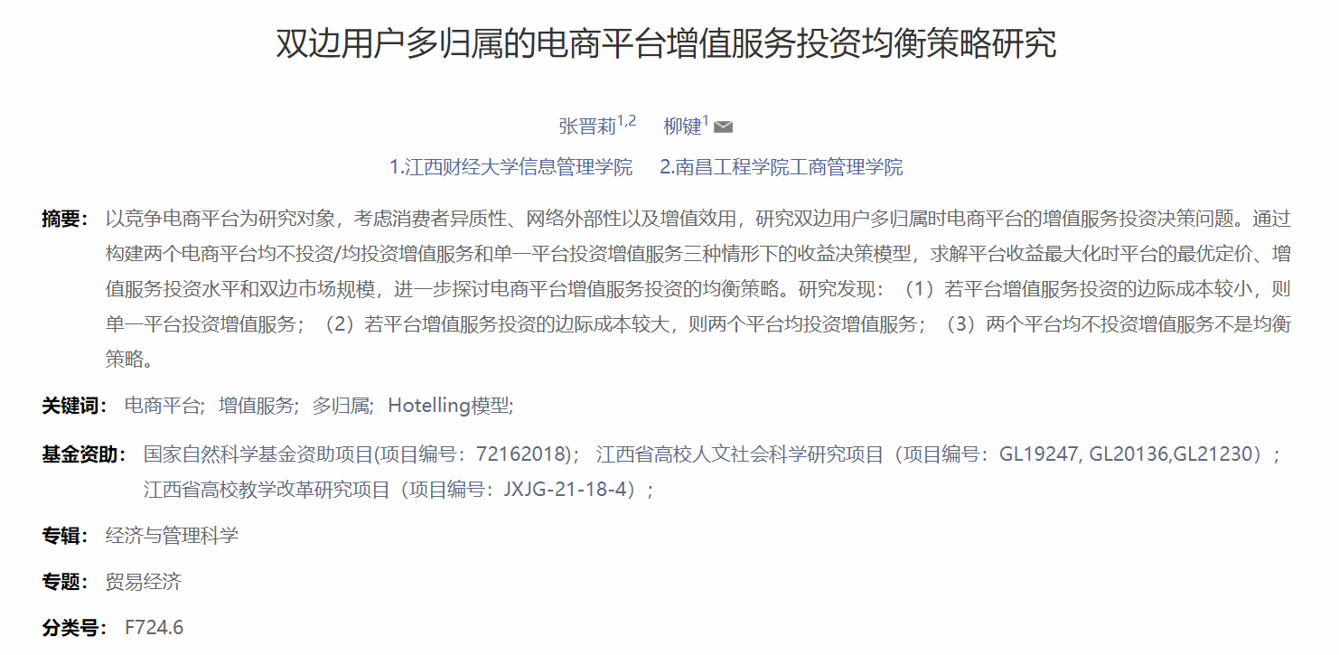 《科学决策》(2023年第12期)刊登了工商管理学院张晋莉博士文章《双边用户多归属的电商平台增值服务投资均衡策略研究》。该文章于2024年被人大复印报刊资料转载。该论文针对电商平台的竞争问题,提出了平台增值服务投资策略。研究发现,平台投资会产生增值效用并增加成本,在一定的条件下会加剧或缓和了竞争,进而影响了增值服务投资策略。