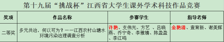 6月8日,第十九届“挑战杯”江西省大学生课外学术科技作品竞赛终审决赛在东华理工大学(南昌校区)圆满落幕。我院金艳清等老师指导的学生团队在此次竞赛中表现出色,经过层层激烈角逐,最终荣获二等奖。