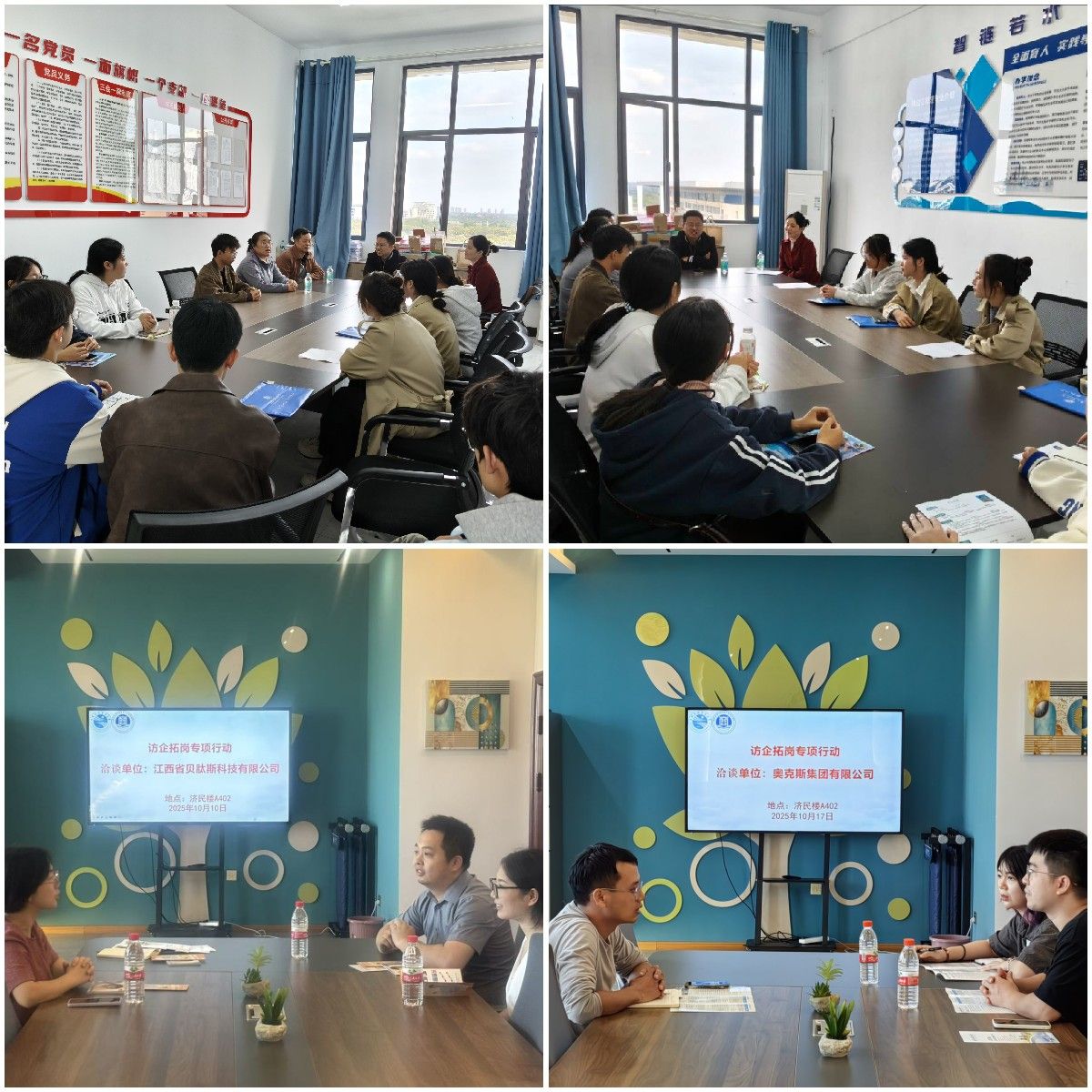 为加强校企合作,拓宽就业渠道,近日,我院开展了访企拓岗专项交流活动,一方面,院党委书记高丽明等就业工作人员深入招聘现场同南昌正大畜禽有限公司、十足集体有限公司、南昌春勤精密技术有限公司、佛吉亚歌乐电子(丰城)有限公司、广东新锦成陶瓷集团有限公司、浙江广润通信有限公司(vivo浙江)、深圳市百腾供应链集团有限公司、江西保利物业管理有限公司、内蒙古蒙牛乳业(集团)股份有限公司、江西白鸥文化创意有限公司、南昌熙颜贸易有限公司、深圳市华展国际物流有限公司、太平洋房地产经纪有限公司、南昌利泽电子有限公司、浙江贝咖供应链管理有限公司、江西省宏彩互动网络科技有限公司、南昌康桥健康体检中心有限公司、九江银行股份有限公司南昌分行等多家公司的招聘人员进行面对面交流。另一方面,邀请江西益丰大药房连锁有限公司、江西省贝肽斯科技有限公司、奥克斯集团有限公司的招聘人员入校洽谈合作。