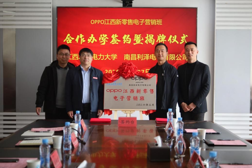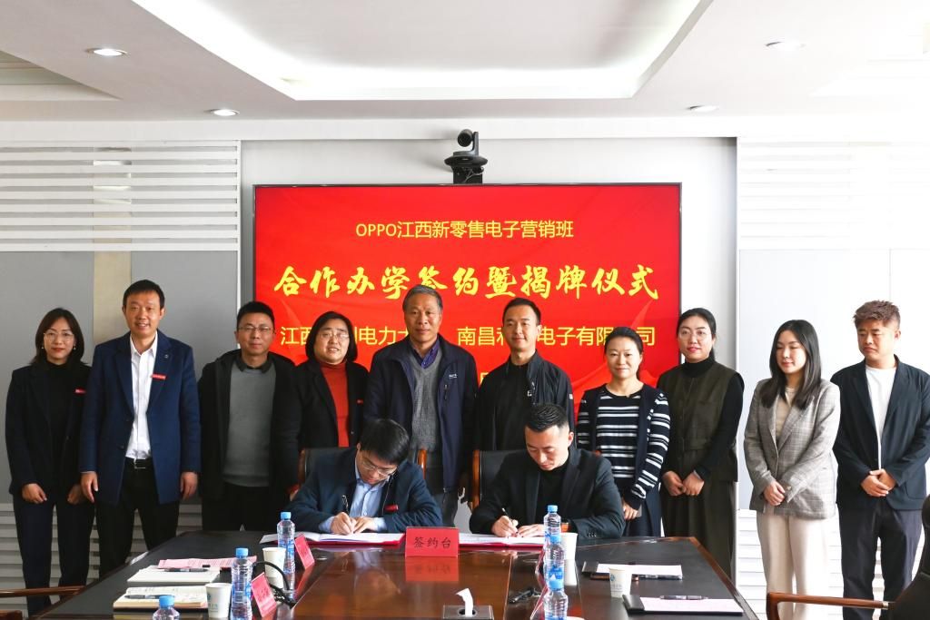 在与会嘉宾的共同见证下,周仲魁与胡建强代表校企双方签署合作办学协议,并为“OPPO江西新零售电子营销班”揭牌。