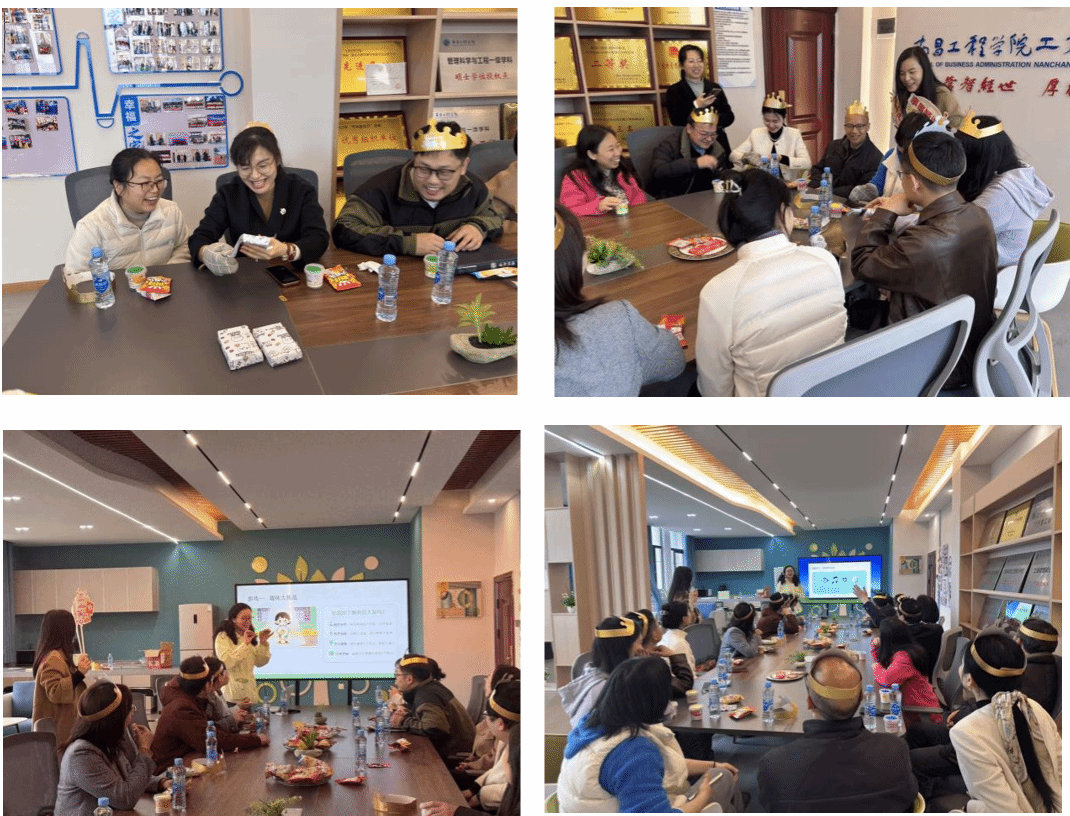 在随后的互动环节中,现场组织了多项趣味小游戏。大家围坐一桌,气氛活跃,参与热情高涨。游戏过程中欢声笑语不断,不同教研室之间的交流更加自然,既释放了工作压力,也增强了团队凝聚力。生日歌环节将活动推向高潮。全体人员齐唱《生日快乐》,为寿星们送上美好祝愿。伴随着温馨的歌声,寿星们许下心愿、共同切蛋糕,分享甜蜜与喜悦。桌上的蛋糕、水果和小食,让整个活动更显温馨亲切。