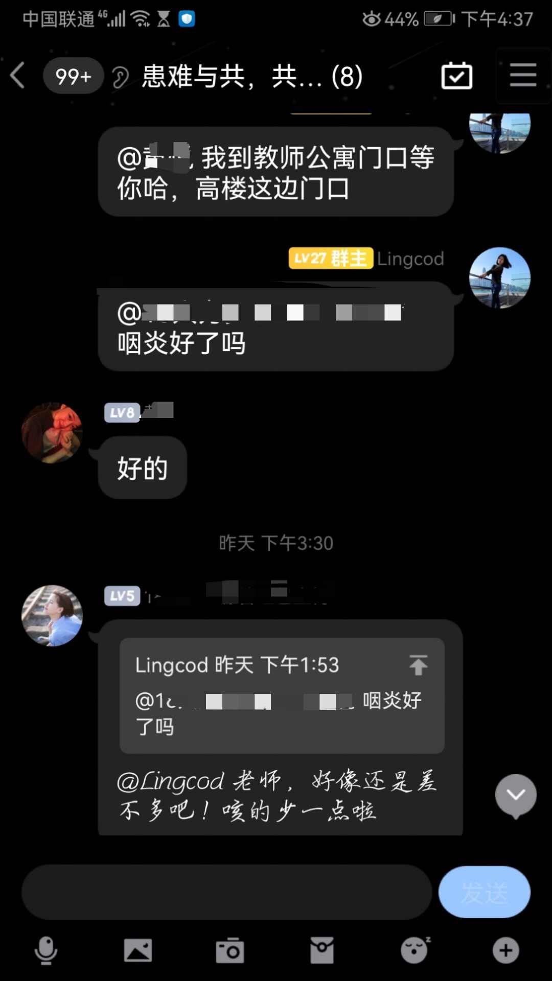 对于暂时隔离在14栋的同学们,龙倩时刻关心他们的身心健康,解决同学们遇到的问题,为同学们送上真挚的关切。
