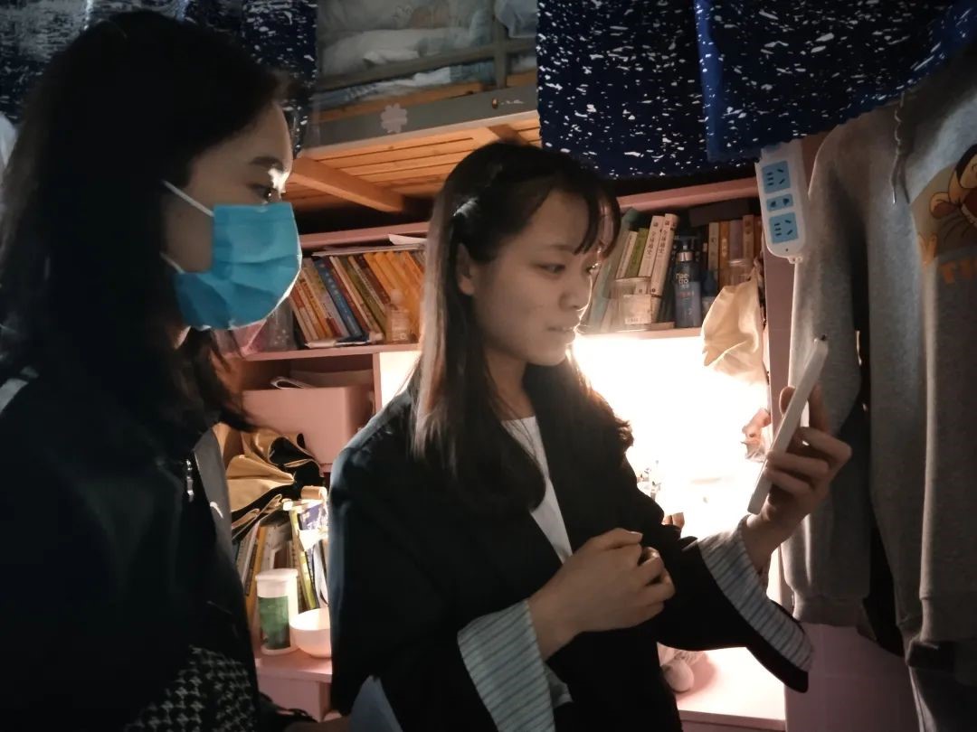 4月6日晚8点,肖斯敏与龙倩带领学生党员志愿者来到学1栋、学6栋、学9栋,深入学生寝室,了解大家近期的学习、生活情况,并且对学生寝室进行了安全大检查。