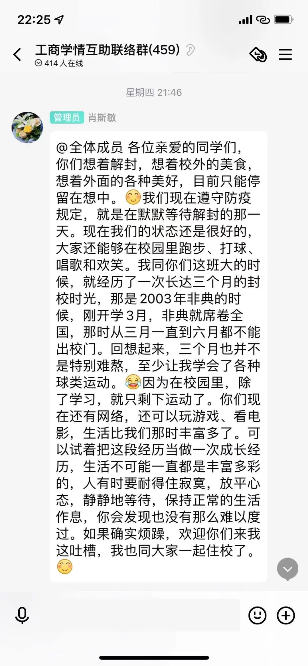 在校园疫情管控愈发严格的今日,不少学生对于解除疫情管控也愈发期待。面对同学们对于何时解控的疑问,肖斯敏以自身在“非典”封校时期的经历为例,耐心地安抚同学们的情绪,并表示自己也在校园中与大家相互守望,共克时艰。