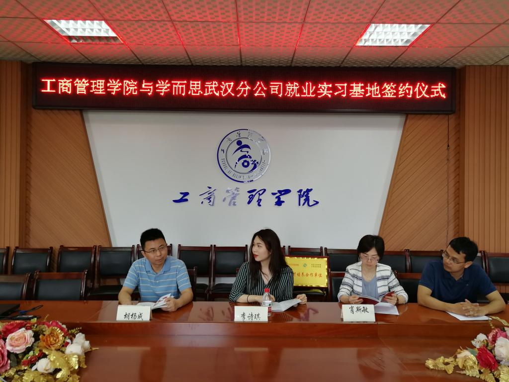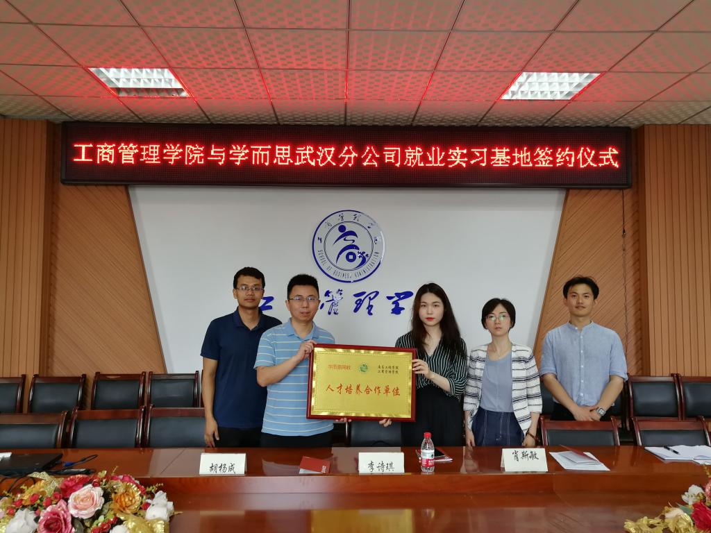 6月10日上午,工商管理学院与学而思网校武汉分公司实习就业基地的签约仪式在教学北楼A510会议室举行。工商管理学院院长胡杨成,院党委副书记肖斯敏、辅导员雷巍以及学而思网校武汉分公司人力资源经理李诗琪和方季羽出席签约仪式。