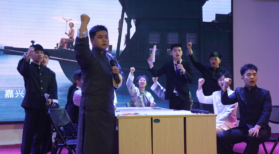 第一篇章演绎了情景剧《红船》,生动再现了1921年召开中共一大的历史,从各地共产主义小组党员代表齐聚上海、会议遇阻、紧急休会到辗转红船,紧贴时代脉搏,引领师生们见证了一个伟大政党的诞生。