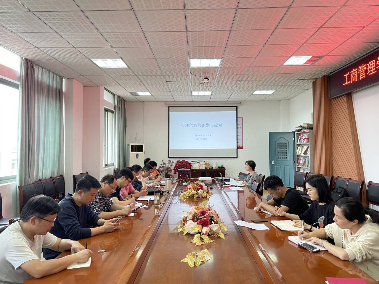 为提升学生工作人员对学生心理危机保障和处置的能力,最大限度地预防和减少心理危机的发生,维护校园稳定,5月10工商管理学院在北A510会议室开展心理危机预防与干预培训,肖斯敏做专题辅导,全院辅导员、班主任共20余人参加培训。