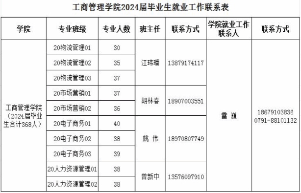 南昌工程学院工商管理学院始建于1986年,秉承“管智经世,厚德博学”的院训,经过近40年的努力,在人才培养、学科建设、科学研究、师资队伍等方面都取得了长足发展,形成了“开拓、进取、求实、创新”的良好院风。学院开设有物流管理、市场营销、电子商务、人力资源管理、农林经济管理(2022年开始招生)、应急管理(2023年开始招生)等6个专业,学院2024届毕业生共计368人,具体各专业介绍及就业工作联系人如下: