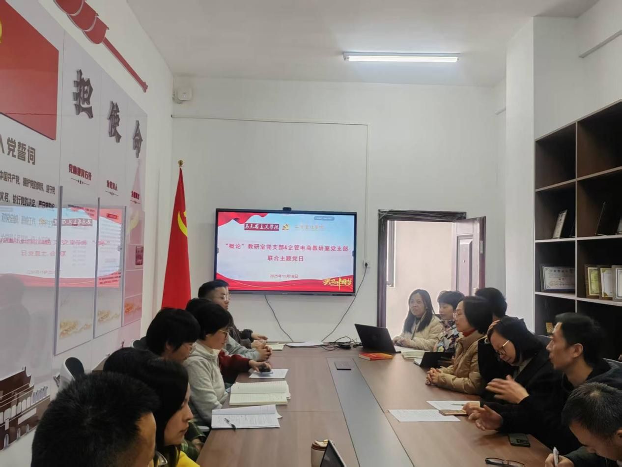 为加强基础党组织建设,推动基层党组织全面进步、全面过硬,11月18日,企管电商教研室党支部与毛泽东思想和中国特色社会主义理论体系概论教研室党支部联合开展结对共建主题党日活动。本次活动以“学深二十届四中全会精神、勇担育人使命”为主题,旨在充分发挥党建优势互补、资源共享、力量整合的积极作用,了解我党中央全会精神对于开展教学和科研工作的深刻指导意义,切实提升思政教师和专业教师的育人水平,促进教师专业成长。