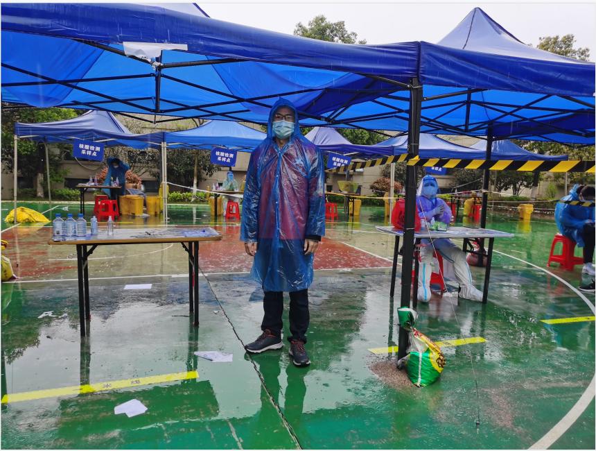 布置好现场后,还需要通知中兴和园的居民下楼做核酸检测。为了确保居民按时按批下楼进行核酸检测,以免出现混乱,让检测更加有序,江玮璠拿着扩音喇叭挨个楼栋进行喊楼,之后参与维护核酸检测现场秩序,并帮助老人提前准备好昌通码以供扫描。尤其是中兴和园第五次核酸检测,当天下起大雨,为了让居民更好地排队进行核酸检测,江玮璠每次趁雨稍微小点的时候,都定期清理地面积水,鞋子完全湿透,双脚都泡在水里。