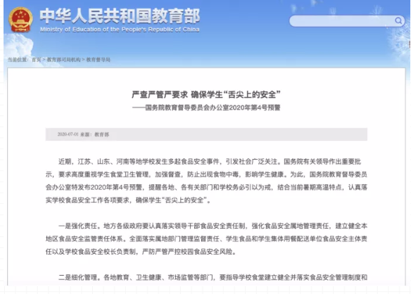 第4号预警要求,各地、各有关部门和学校要高度重视食品安全问题,认真落实食品安全工作各项要求,确保学生“舌尖上的安全问题”。