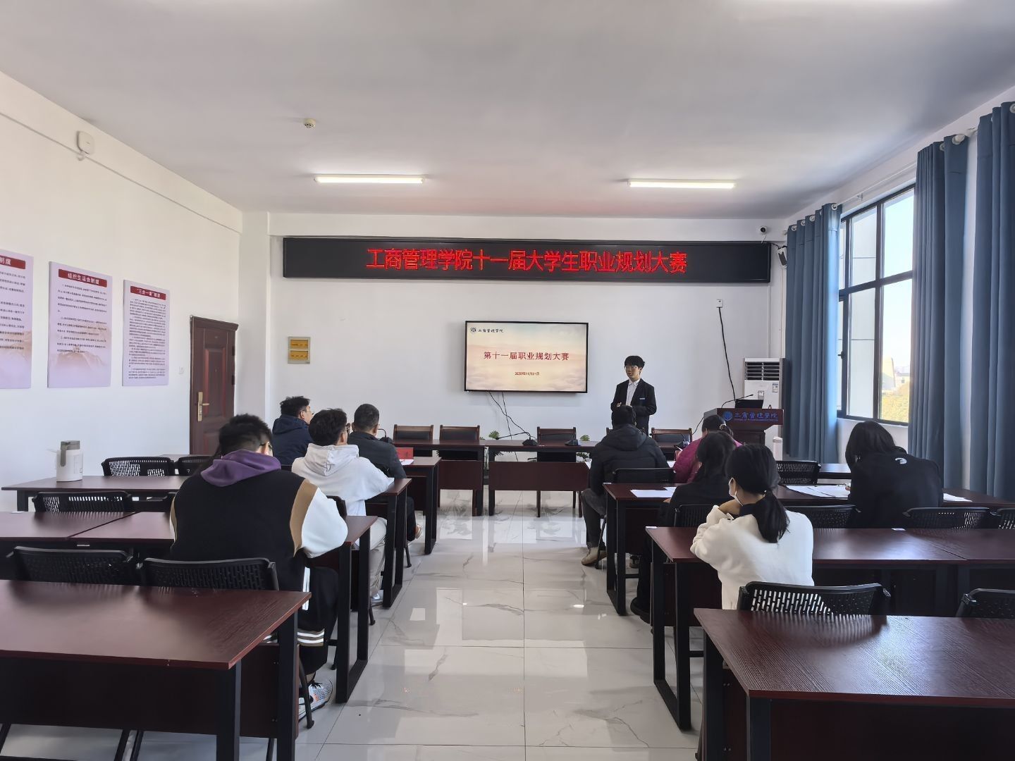 当青春撞上职业蓝图,会擦出怎样的火花?为帮学生们锚定职业方向,提升职业规划能力,我院于11月21日及11月24日在济民楼A412就业宣讲室分成长赛道、就业赛道开展第十一届大学生职业规划大赛。本次大赛邀请了我院辅导员雷巍、方蕈及专业教师魏汉英、刘斌、王敏等担任评委,全程护航这场“未来攻略战”。
