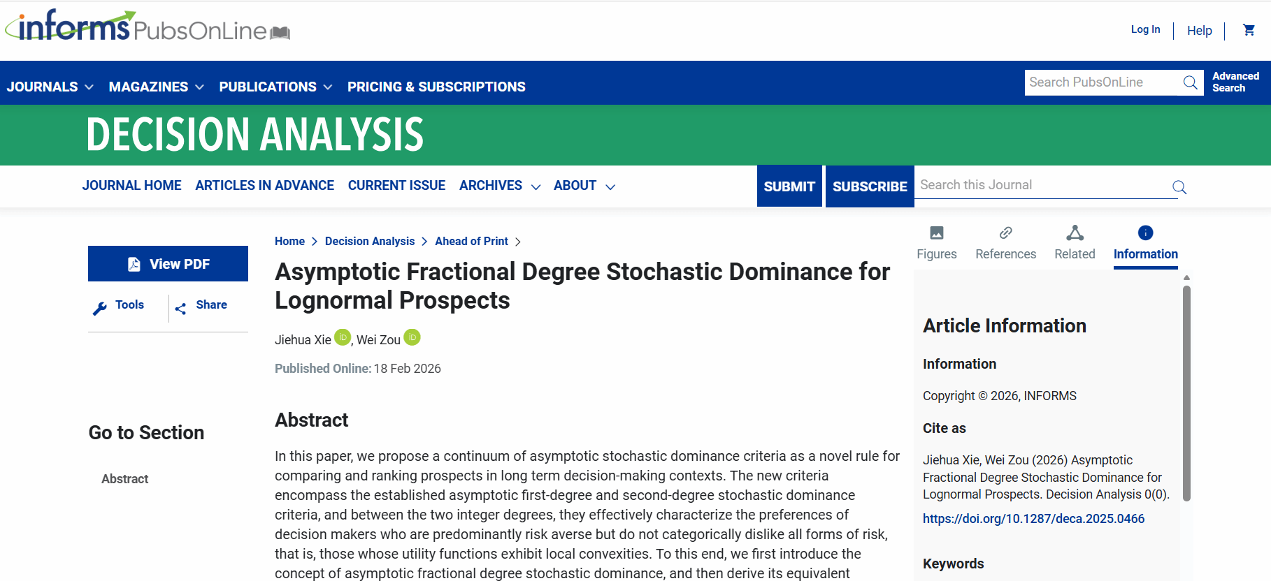 近日,我院瑶湖学者谢杰华教授在国际权威期刊《Decision Analysis》发表最新研究成果“Asymptotic Fractional Degree Stochastic Dominance for Lognormal Prospects”。