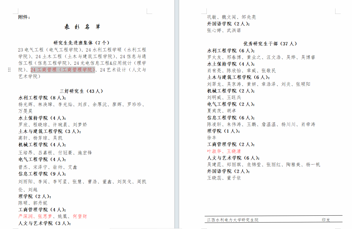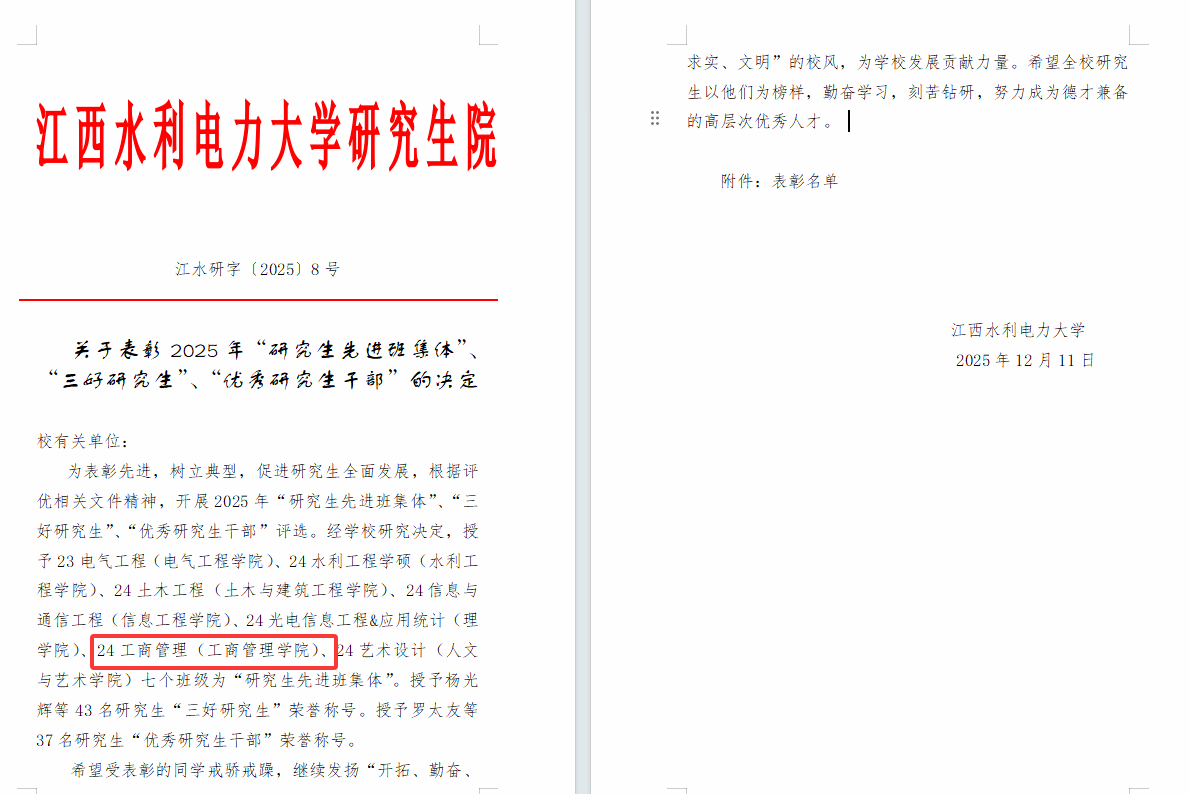 近日,江西水利电力大学研究生院正式发布《关于表彰2025年“研究生先进班集体”、“三好研究生”、“优秀研究生干部”的决定》(江水研字[2025]8号)。在此次全校范围的评优表彰中,工商管理学院(MBA)学子表现突出,荣获集体与个人多项荣誉,充分展现了MBA学生勤奋务实、全面发展的卓越风采。